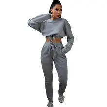 Casual Women Two Piece Set O-neck Shirt Crop Top + Long Pants Leggings Female Sportwear Outfit Solid Color